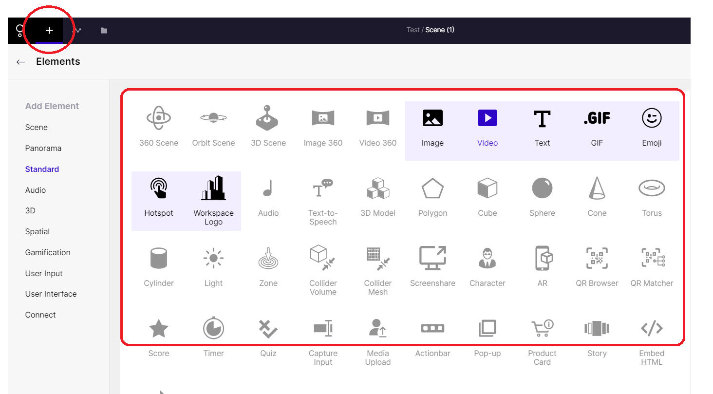 Add various elements such as scenes, images, videos, GIFs, audio, and other multimedia components into your experience.