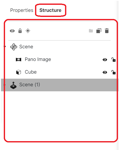 This displays a comprehensive list of all the elements, scenes, and lighting configurations used in your virtual environment.