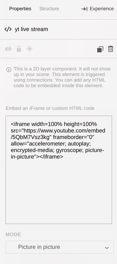 In the experience editor, add an EmbedHtml element. In the space provided, add the embed code copied from youtube.