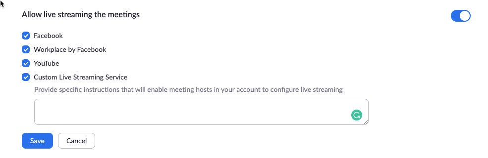 Allow live streaming the meetingsunderIn Meeting (Advanced), and enableYoutube.
